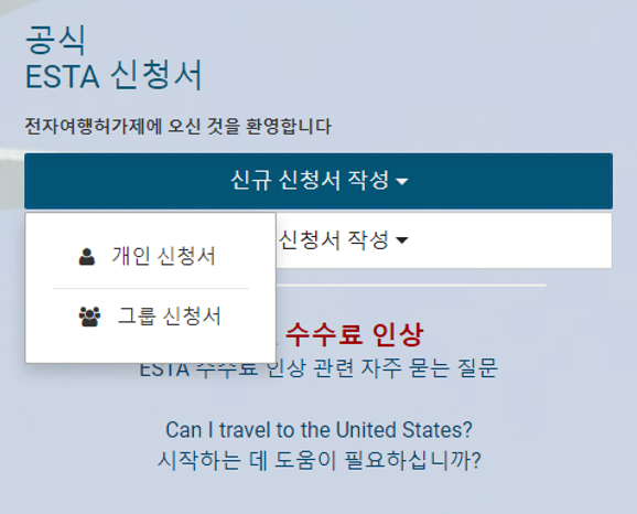혼자 여행할 예정이기 때문에 [신규신청서 작성] - [개인 신청서 작성]을 클릭합니다. 이제 사전준비가 완료 되었습니다. 다음 화면부터 앞선 포스팅에 소개해드렸던 ESTA 신청순서대로 진행하게 될 것입니다.