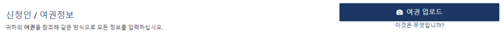이 단계 부터 여권정보를 포함한 모든 정보를 모두 영어로 입력합니다. 국적의 경우, 대한민국은 South Korea로 등록되어있습니다. 우측에 위치한 여권 업로드 버튼을 이용해 여권사진을 업로드 하면 자동으로 칸이 채워집니다.(저는 여권 업로드 버튼을 이용하지 않고 직접 입력했습니다.)