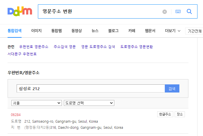 이번 단계에서는 한국의 연락처, 주소, 가족정보, 회사정보를 입력합니다. 영어 주소는 아래와 같이 다음 검색을 이용해 빠르게 변환할 수 있습니다.