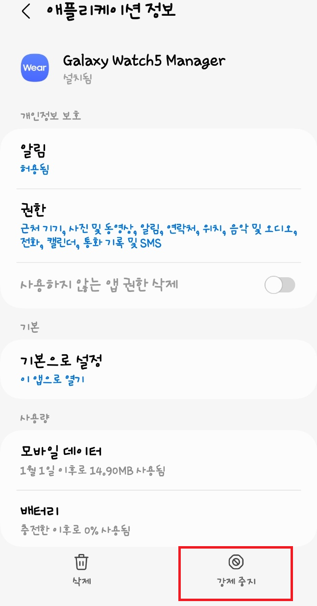 설정 - 애플리케이션 - galaxy watch 5 manager - 강제중지
