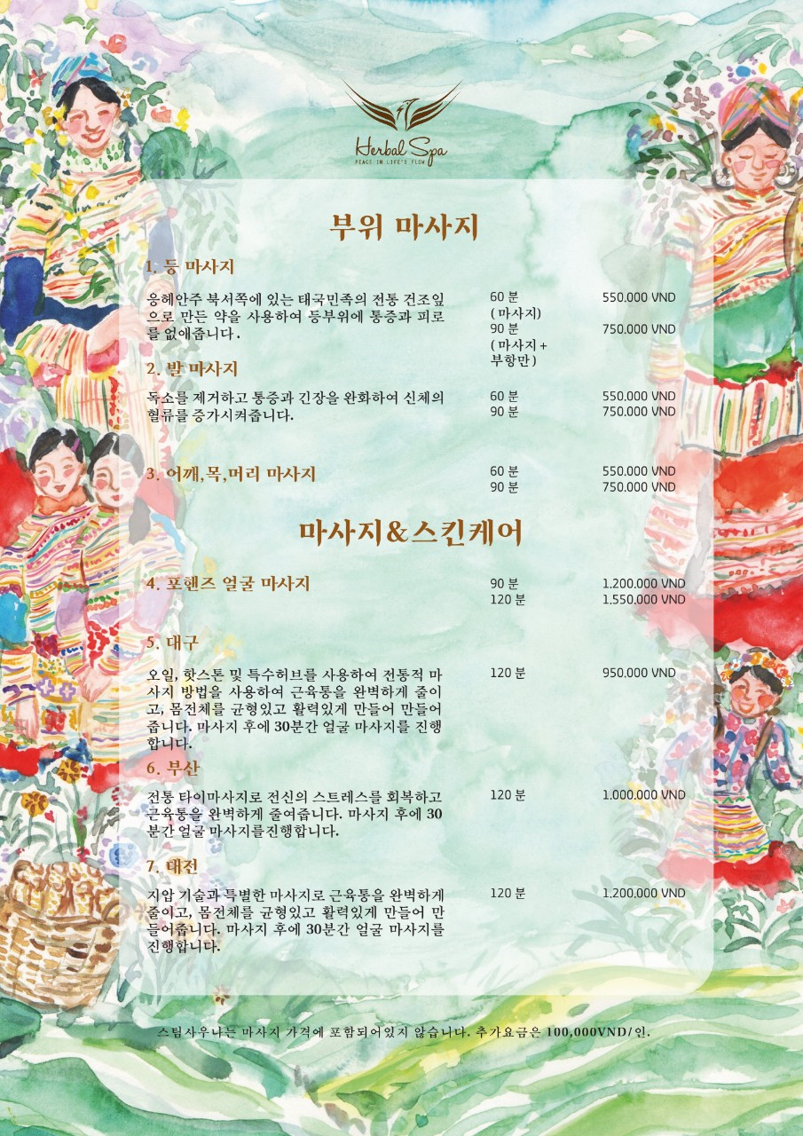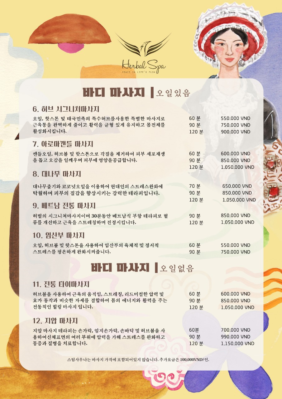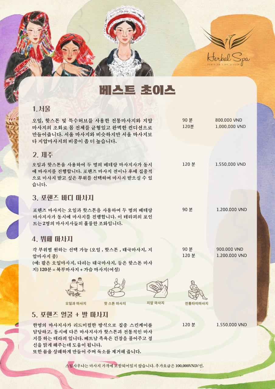 저는 이번 베트남여행에서 허벌스파(Herbal spa)를 무려 2회나 이용했는데요. 허벌이라니까 대충하는거 같기도 하고 그런데, 그런거 아니고 허브로 하는 마사지 입니다 ^^ 직원들이 모두 한국어에 능숙하고 카카오톡으로도 예약이 되어 이용하기 아주 편리했습니다. 첫날에 마사지를 받아보고 만족해서 며칠 뒤에 시간을 길게해서 한 번 더 받았습니다.