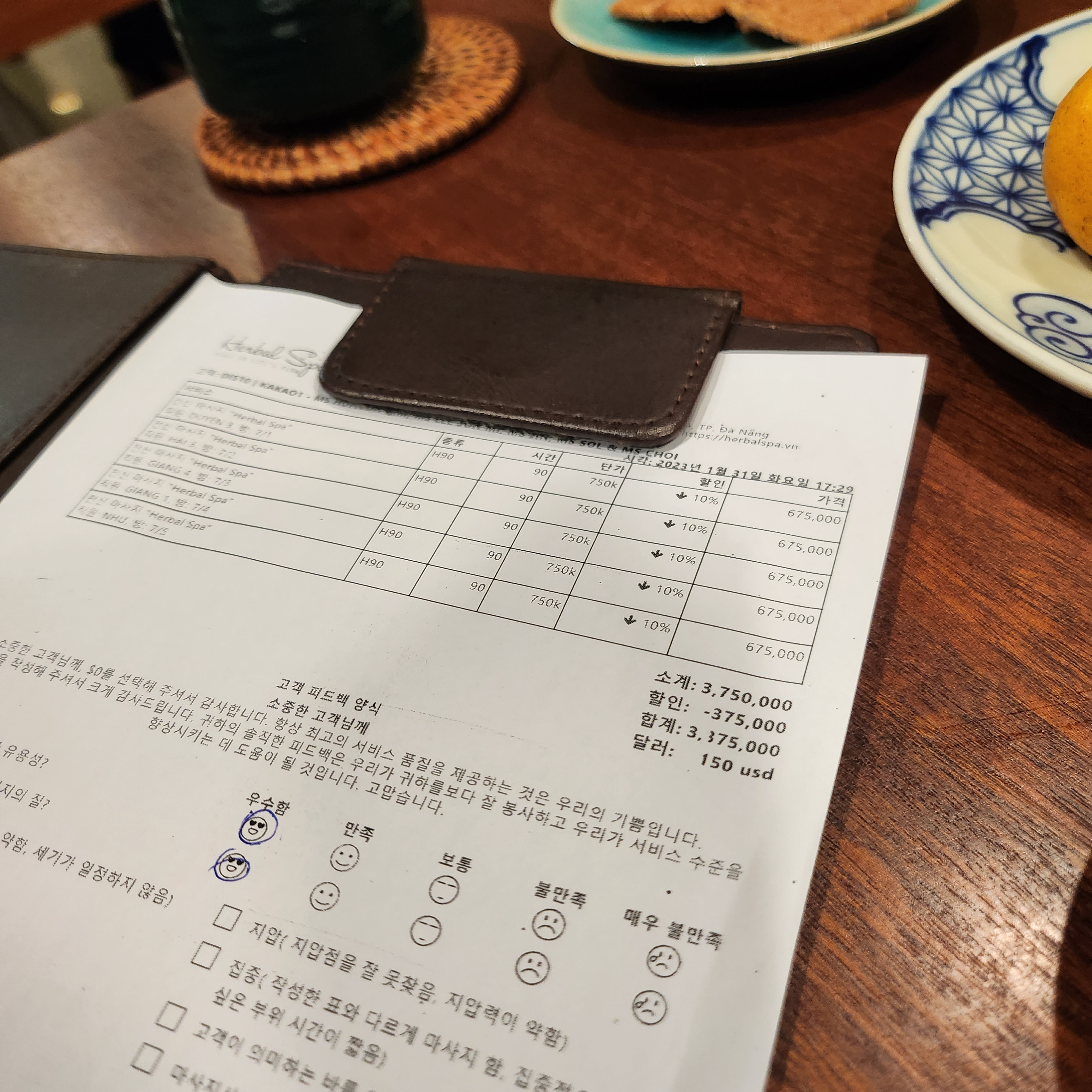 따뜻한 죽과 과일을 먹으며 피드백 설문지를 작성하고 결제를 하면 끝입니다. 2회 차 방문에는 기본 5%할인에 5%를 추가로 할인해주었습니다. 끝나고 주는 코코넛과자가 맛있어서 물어보니 허벌스파에서 자체로 제작한 과자라고 하더라고요. 마트에서 파는 것도 먹어봤는데, 허벌스파 코코넛과자가 더 맛있길래 그것도 좀 사왔습니다. 한 개에 5만동이었습니다.