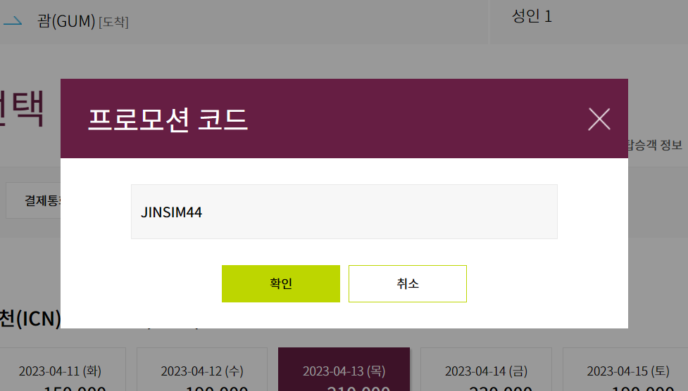 4. 짠! 아래와 같이 팝업화면이 뜨면, 프로모션 코드가 적용된 모습을 확인하실 수 있습니다.