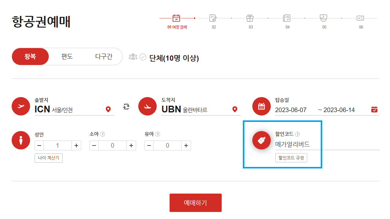 1. 항공권 예매 시 아래 파란색으로 표시한 부분과 같이 할인코드 입력칸에 메가얼리버드를 입력하세요.