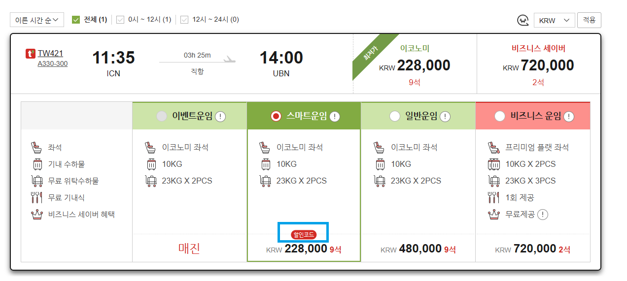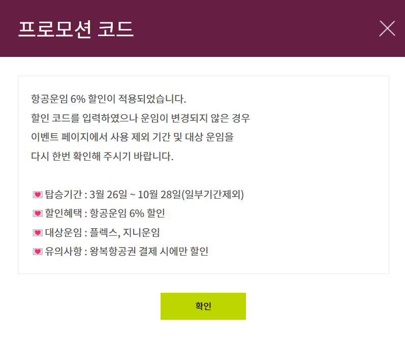 - 편도, 왕복 항공권에 모두 적용 가능한 프로모션입니다.