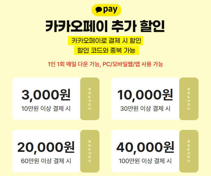 카카오페이로 결제 시 아래와 같이 추가 할인도 적용가능하니, 티켓팅 전에 꼭 다운 받아두시기 바랍니다. 다만 한번 사용했다가 취소하는 경우 카카오페이 추가 할인쿠폰은 복구 되지 않는다는 점 알아두세요!