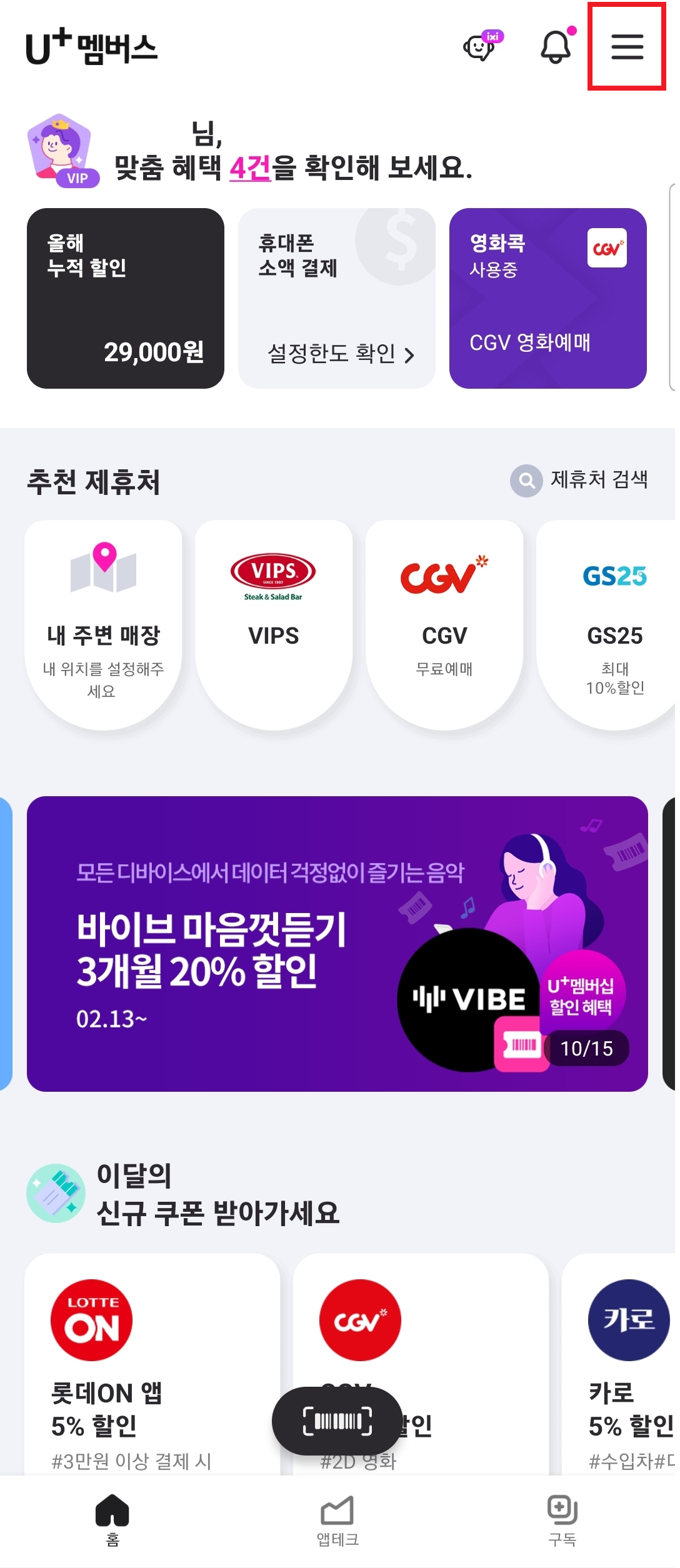 1. U+ 멤버스 어플리케이션을 실행합니다.