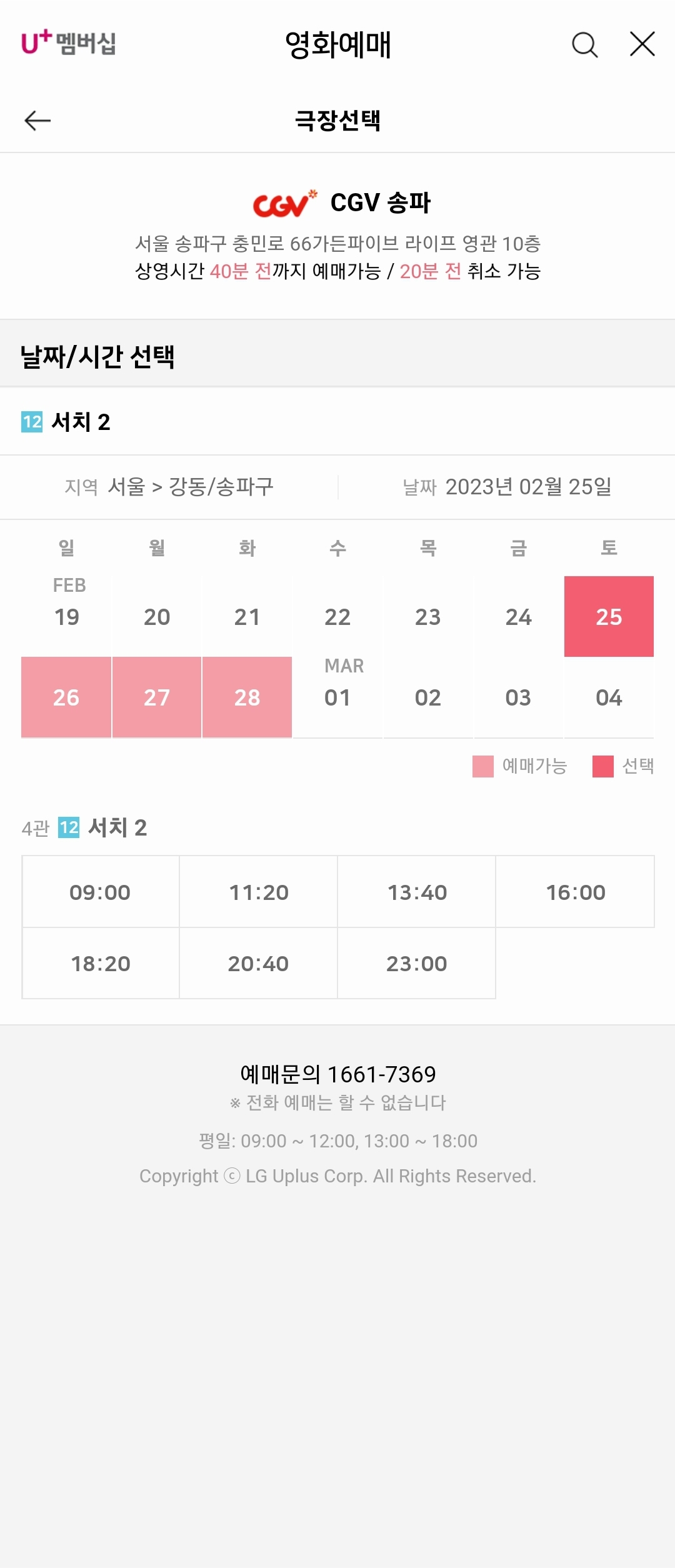 1인 예매의 경우, 인원은 1을 선택하고 영화 콕 혜택에서 영화무료예매: 1매 무료 클릭, 2인 예매의 경우 인원은 2를 선택하고 영화 1+1예매를 클릭합니다. 3인이상의 경우는 LGU+앱에서 정가를 다 주고 결제하는 것보다는 카드나 영화앱 등 다른 혜택을 받아서 예매하는게 더 합리적일듯합니다.