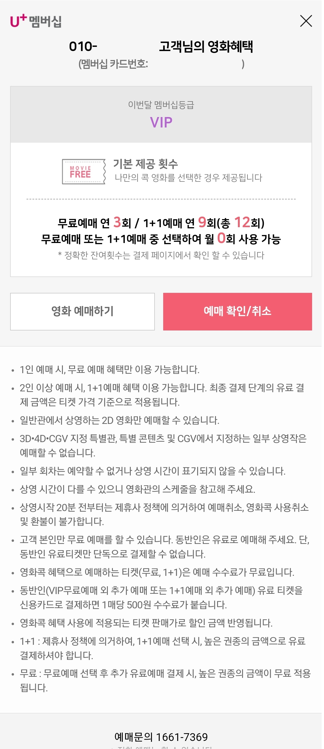 참고로, 영화혜택은 이전에 비해서는 더 안좋아졌습니다. 과거에는 한 달에 1회씩 무료로 12회 예매할 수 있었는데요. 언젠가부터 무료 3회, 1+1예매 9회로 바뀌었고, 월 1회만 사용할 수 있는 제한은 동일합니다. 이제 더이상 혼자 영화를 볼 수 없게 되었습니다.