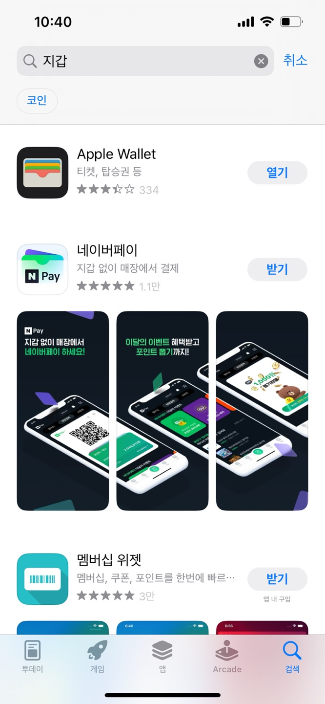 1. 먼저 지갑 어플리케이션을 실행합니다. 저의 경우 그동안 한국에서 지갑 어플을 쓸 일이 없었기 때문에 사진과 같이 앱스토어에서 검색해서 실행시켜줬습니다.