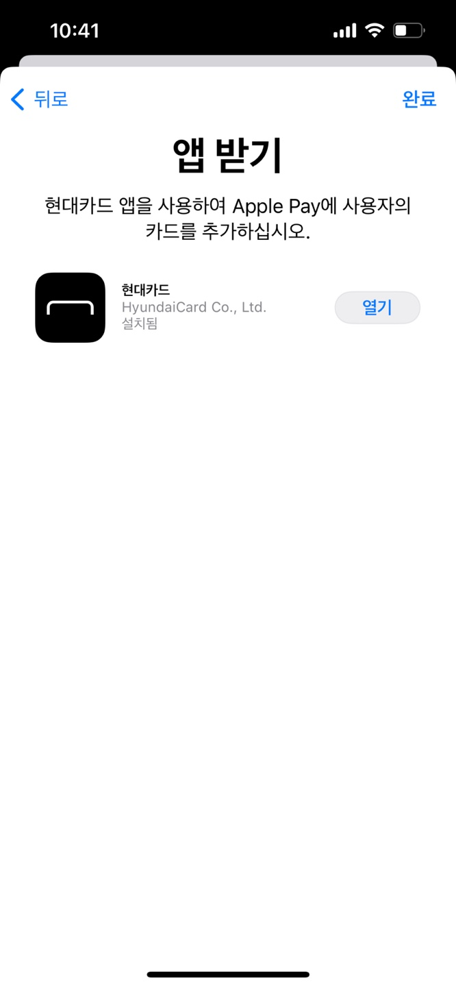3. 현대카드 앱이 설치되어 있는 경우 이렇게 앱끼리 연동이 되어 보다 편리하게 카드 등록을 마칠 수 있습니다. 왼쪽 사진에서 열기 버튼을 클릭하면 사용 및 추가가능한 카드의 리스트가 나오고, 몇 가지 약관에 동의만 해주면 카드를 추가할 수 있습니다.