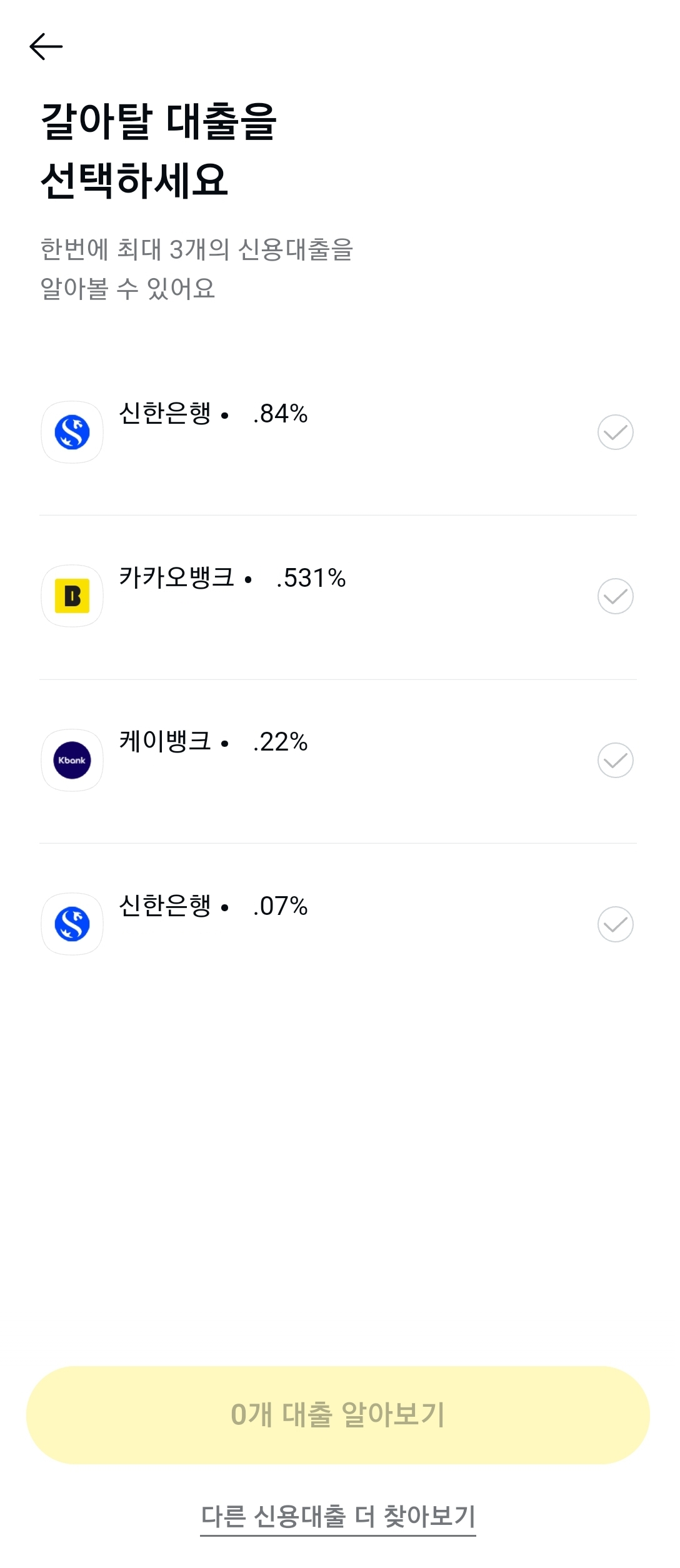오늘은 이렇게 카카오페이 앱에서 신용대출을 갈아타는 방법에 대해서 알아보았습니다. 직접해보니 정말 빠른 시간에 내가 가진 대출 조회 및 갈아탈 대출 조회까지 완료가 되었습니다. 저는 검색된 대출이 큰 메리트가 없어서 갈아타기까지는 시도해보지 않았는데, 실제로 대환대출 과정도 꽤 간단하다고 하니 높은 금리의 신용대출을 가지고 계신분들은 한번 쯤 조회해보시기 바랍니다.(간단한 신용조회 몇 번 정도는 신용점수에 영향이 없다고 합니다.)