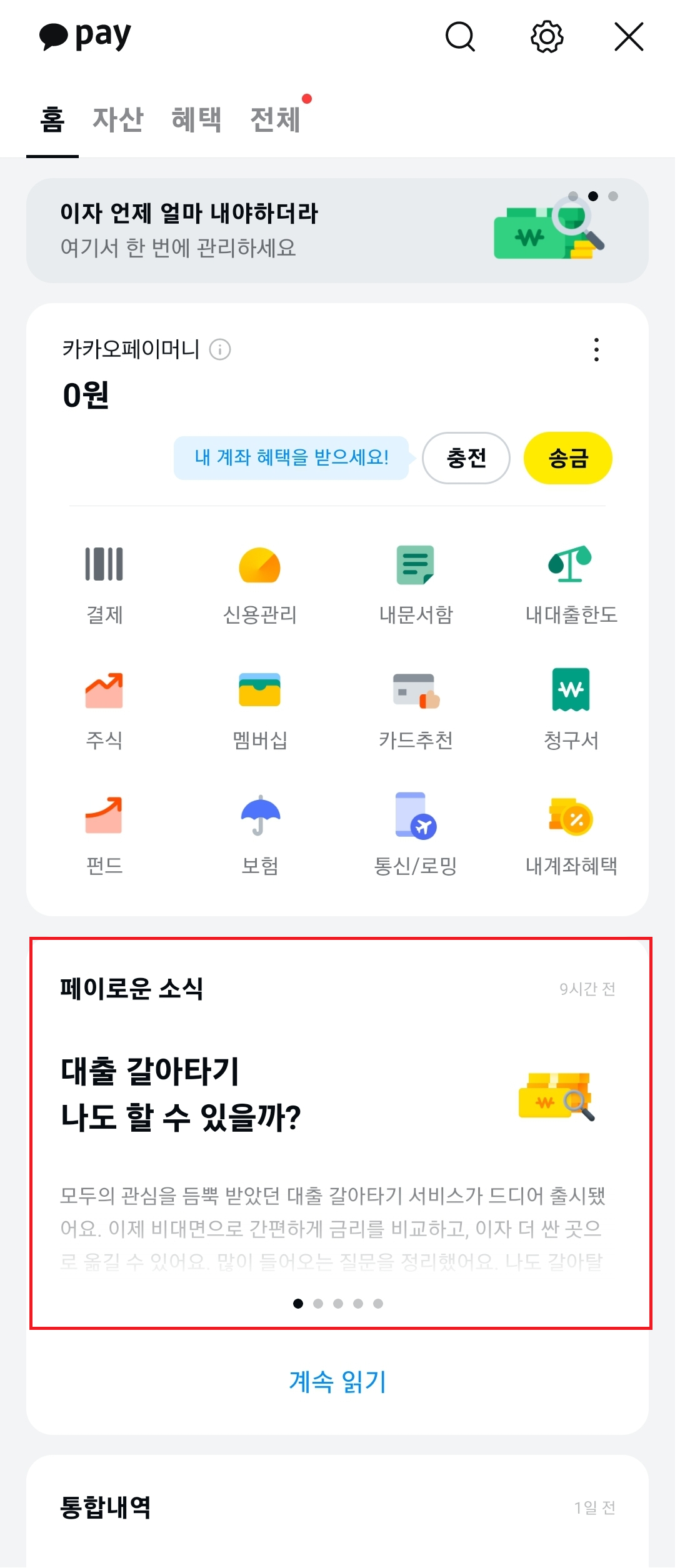 2. pay 화면 중간 쯤에 표시되는 페이로운 소식 글을 클릭하면 대환대출 조회화면으로 빠르게 이동할 수 있습니다.