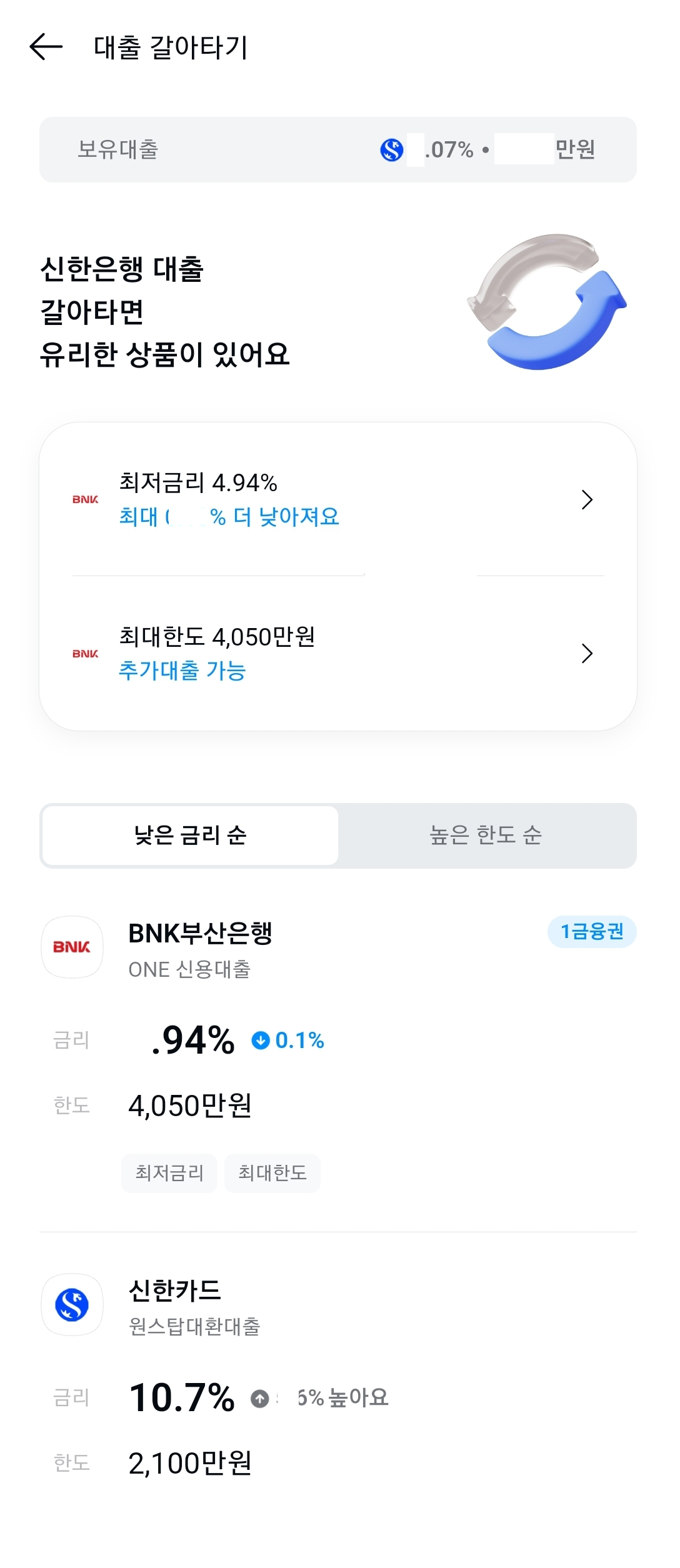5. 마지막으로 검색된 대출 정보를 확인할 수 있습니다. 낮은 금리 순, 높은 한도 순으로 구분되어 나타나기 때문에 현재 상황에 더 적합한 대출을 선택하여 대환할 수 있습니다.
