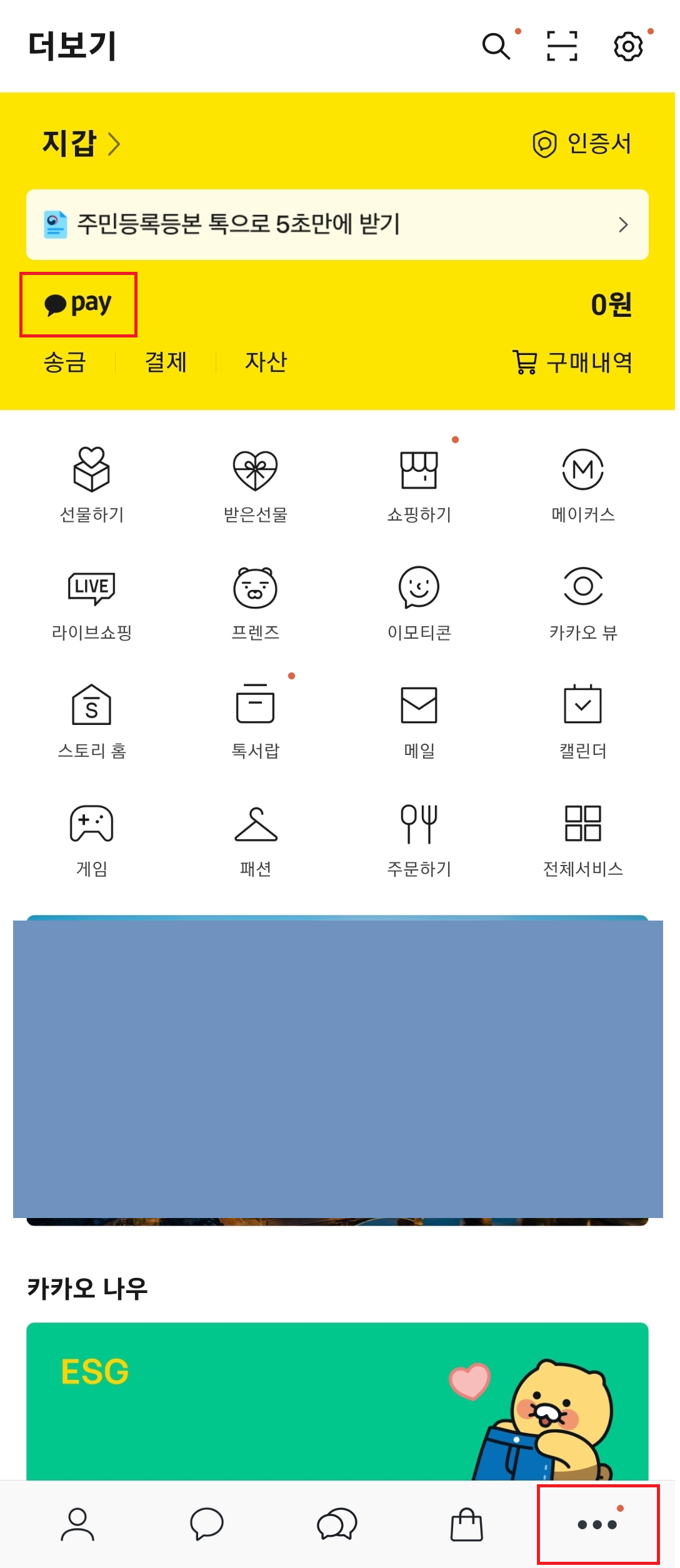 1. 카카오톡 앱을 실행하고 오른쪽 아래 점 세 개를 클릭하면 나오는 화면에서 pay를 클릭해주세요.