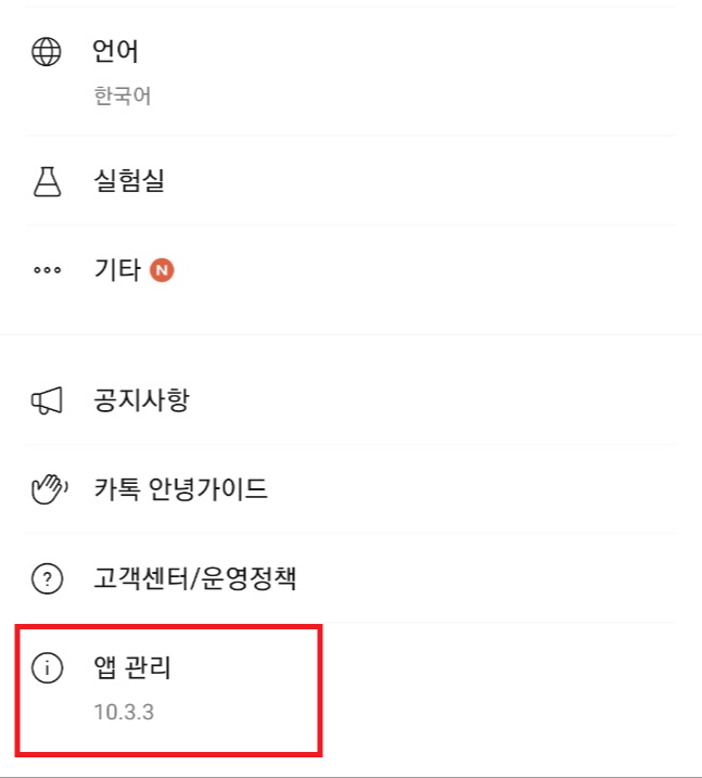 3. 화면 맨 아래로 내려서 앱관리 아래 적힌 카카오톡 버전이 10.3.0 이상인지 확인