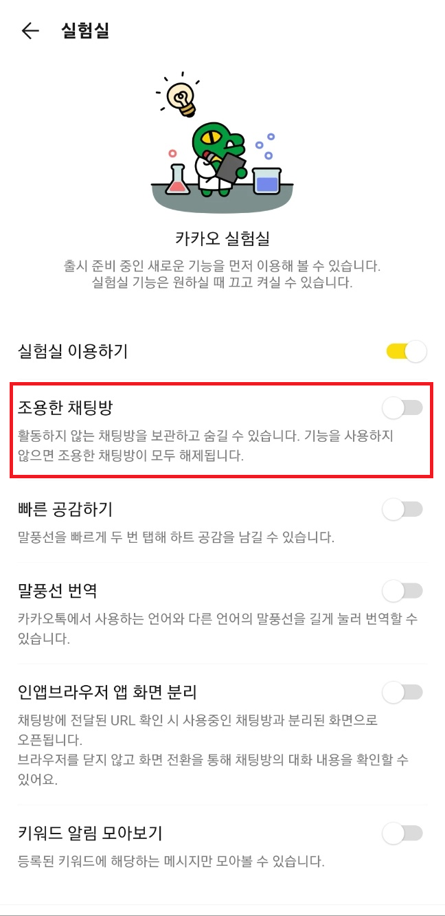 카카오톡을 실행하고 순서대로 클릭하여 카카오톡 설정에 진입해서 실험실 메뉴를 클릭해주세요. 실험실 안으로 들어가면 조용한 채팅방 설정이 보일텐데요. 동그라미가 왼쪽에 있고 회색으로 표시되어있다면 기능이 꺼져있는 상태입니다. 동그라미를 클릭해서 노란색으로 표시되도록 설정을 바꿔주세요.