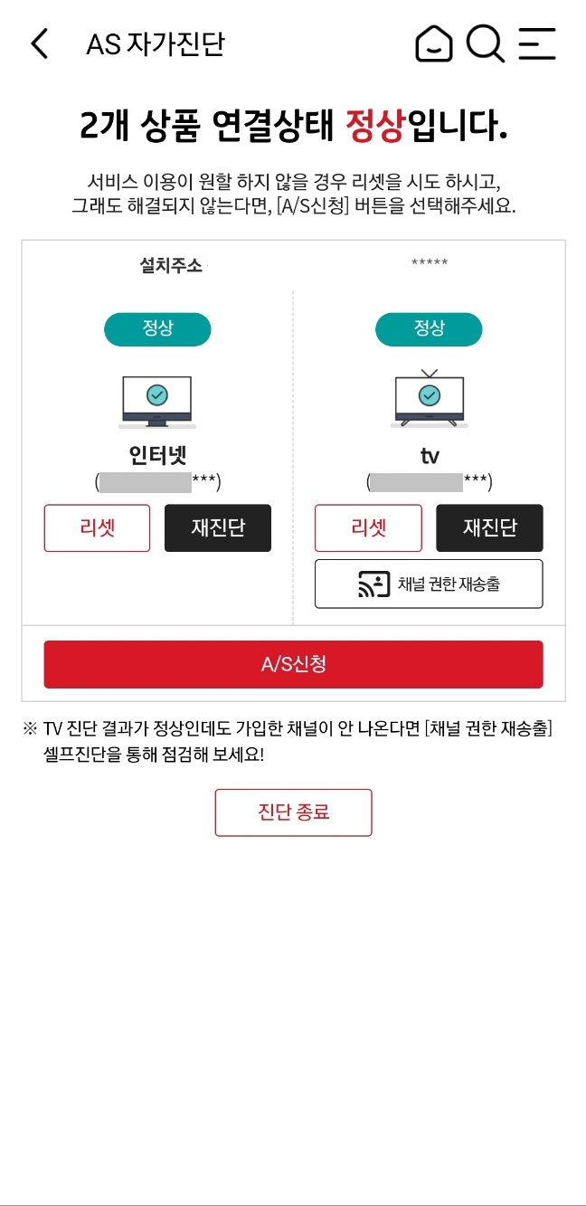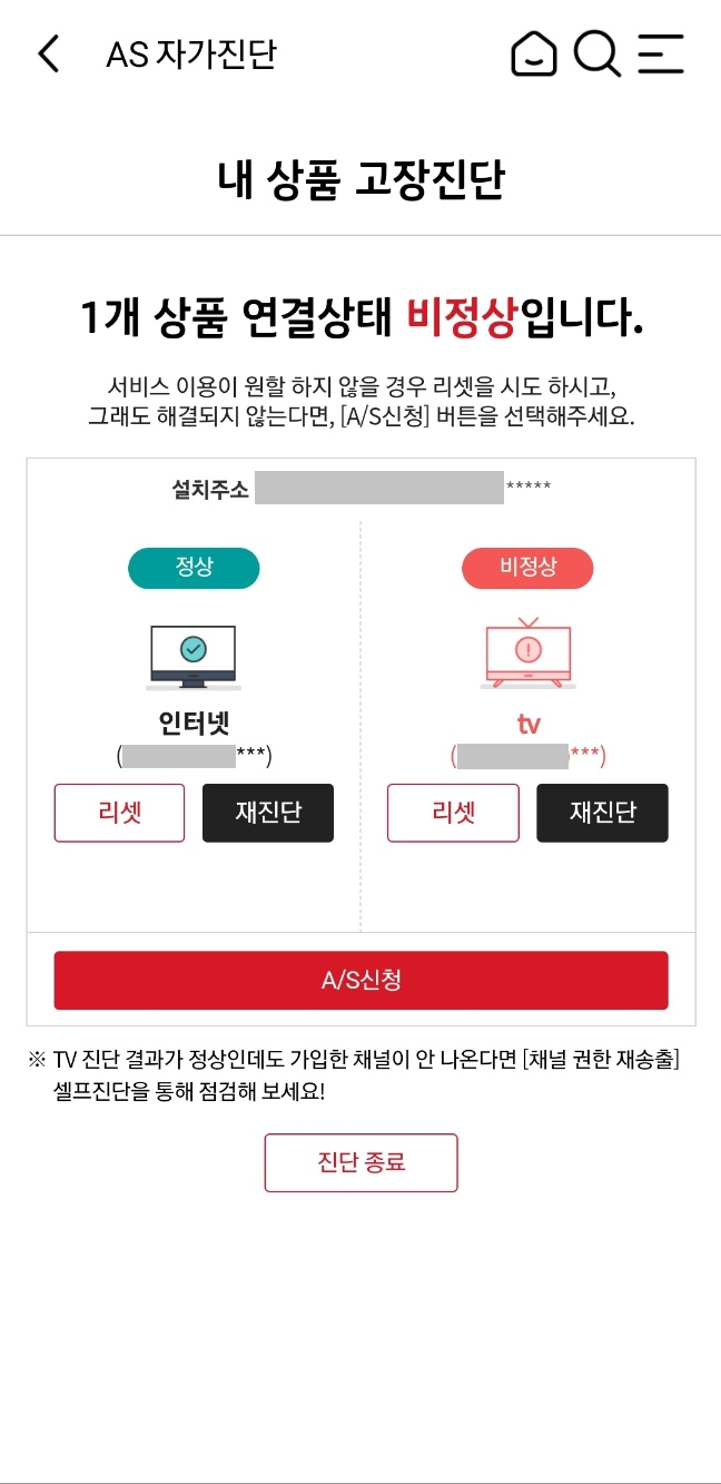 3. 다음 화면으로 넘어가서 화면을 조금 내리면 있는 내상품 진단하기 버튼 클릭해주세요. 그러면 내가 현재 이용하고 있는 상품의 상태(정상 및 비정상)를 확인할 수 있습니다. 저의 경우 TV에 문제가 있었고, 고장진단 화면에는 빨간색으로 비정상이라고 표시되어 있었습니다. TV 아래에 있는 리셋 버튼을 클릭해주세요. 리셋 이후에도 문제가 해결 되지 않는다면 그 때 A/S 신청을 하시면 됩니다.