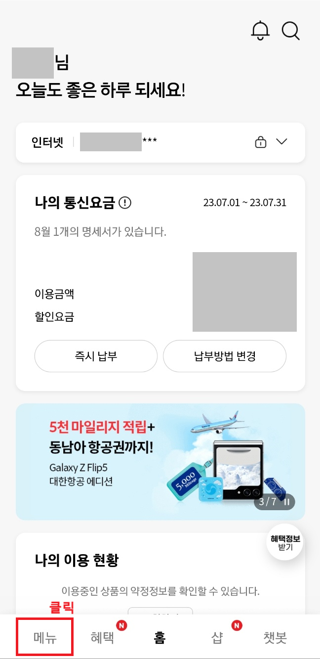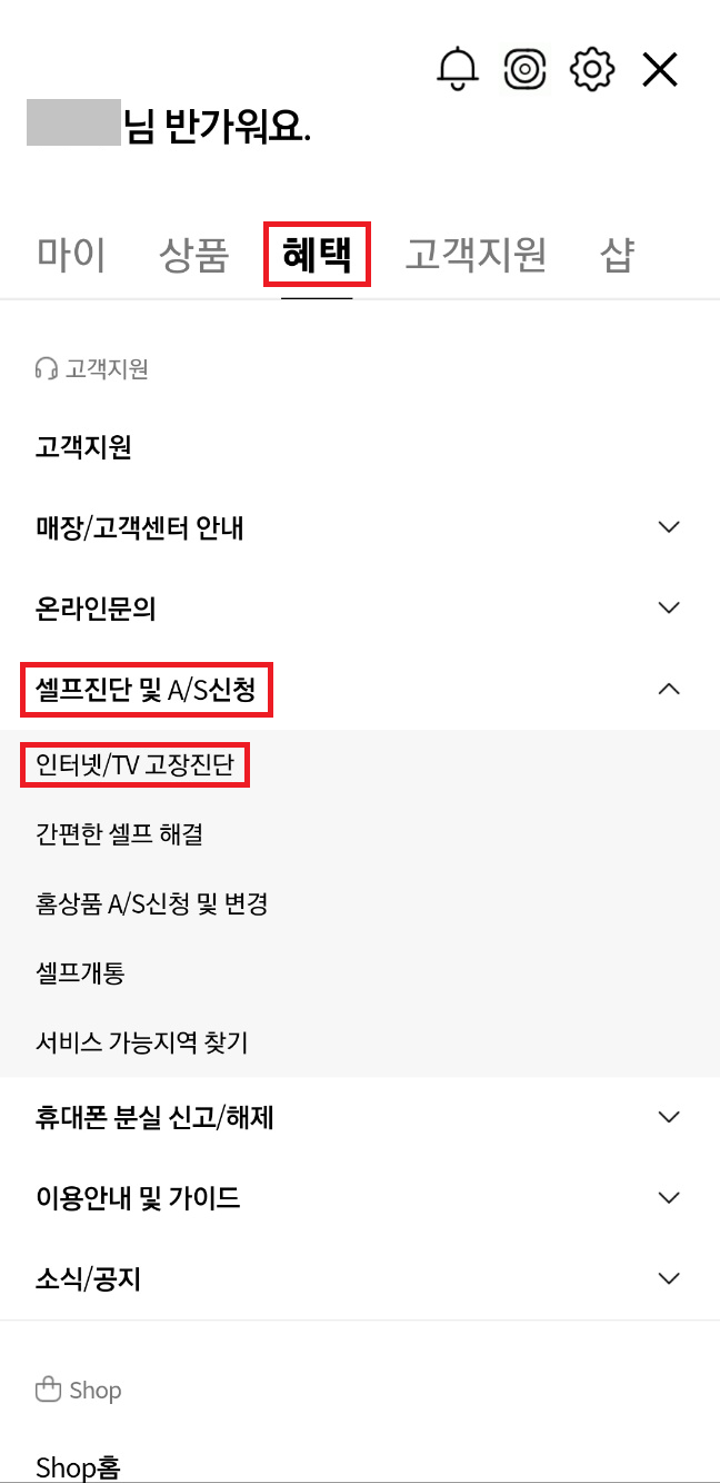 2. 어플리케이션을 실행한 뒤 화면 좌측 아래 위치한 메뉴를 클릭하시고, 혜택 탭의 셀프진단 및 A/S 신청, 인터넷/TV 고장진단 메뉴를 차례로 클릭해주세요.