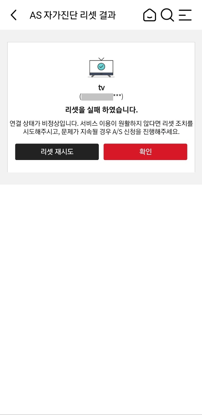 4. 휴대폰 인증 후 본격적으로 리셋할 수 있는 화면이 나오게 됩니다. 저는 TV 리셋이 한번에 성공되지 않아서 리셋 재시도를 몇 번 더 클릭 해 주었습니다.