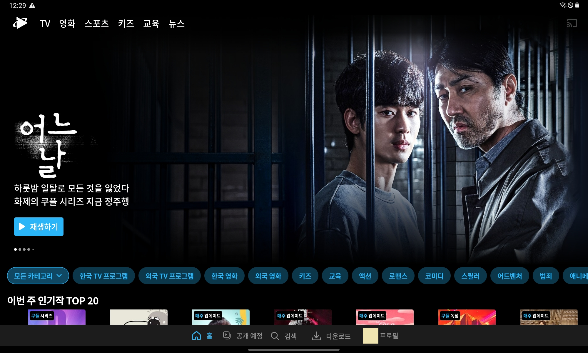 1. 먼저 쿠팡플레이 앱을 실행하세요. 태블릿은 자동으로 가로화면으로 바뀌는데, 세로화면이든 가로화면이든 상관없으니 이 부분은 무시하셔도 됩니다.