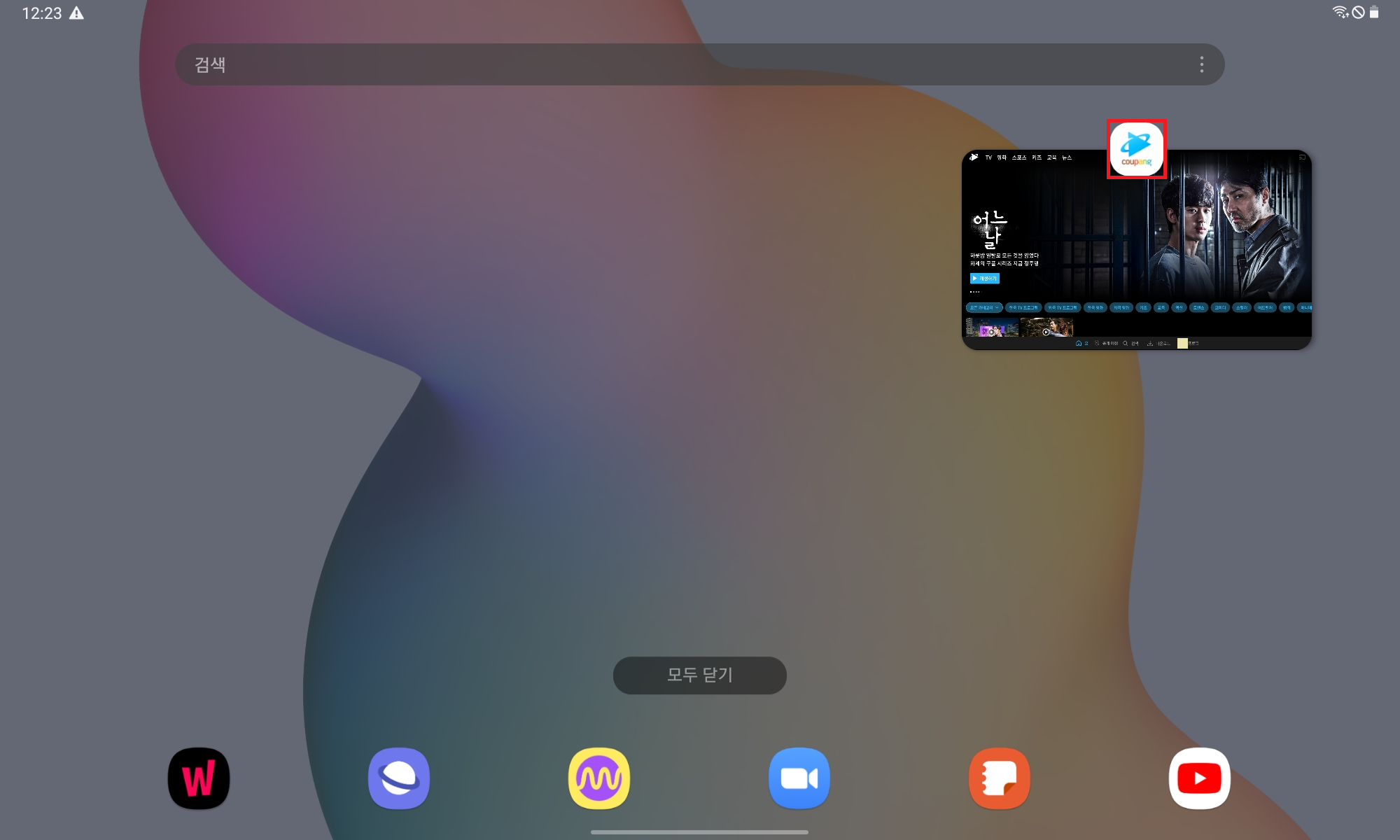 아래처럼 최근 앱 보기 화면으로 이동하셨다면, 빨간색 네모로 표시된 쿠팡플레이 어플 아이콘을 한번 터치하세요.