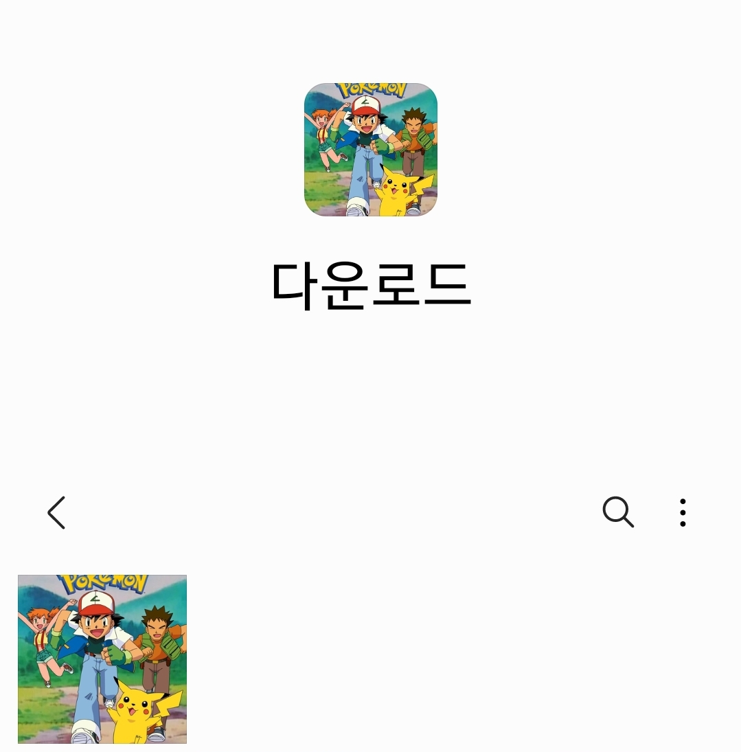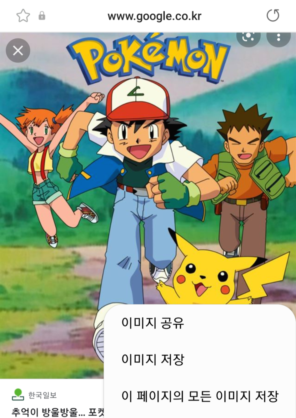 저는 요즘 대란을 일으키고 있는 포켓몬빵 유행에 탑승하고자 포켓몬스터1기 포스터 사진을 골랐습니다. 네이버나 구글에 사진을 검색한 후 꾹 누르면 이미지 저장 혹은 다운로드 하기 라는 메뉴가 보일 것입니다. 클릭해서 해당 이미지를 저장하고, 아래 사진처럼 갤러리에 다운로드한 이미지가 잘 저장되었는지 확인해주세요.