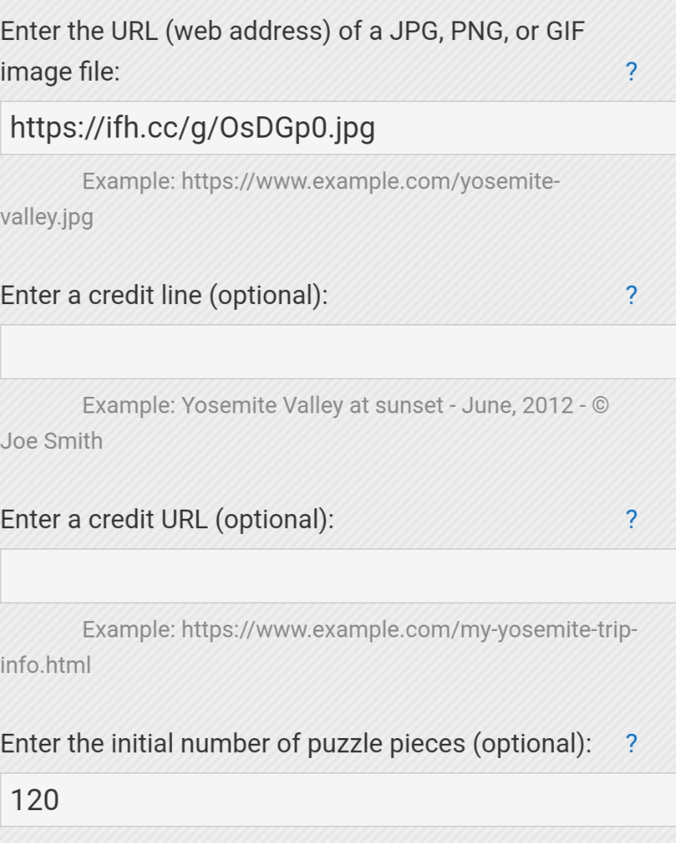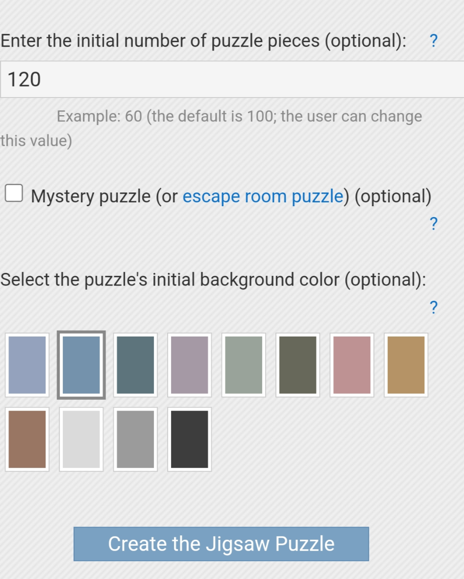 첫 번째로 보이는 빈칸[Enter the URL(web address) of a JPG, PNG, or GIF image file]에 2번에서 복사한 이미지 주소를 붙여넣기 합니다. 그리고 네 번째 빈칸[Enter the initial number of puzzle pieces(optional)]에 생성하고 싶은 퍼즐 조각의 갯수를 입력해주세요. 저는 120조각으로 했습니다. 입력하지 않으면 기본 100조각으로 생성되며, 퍼즐조각의 갯수는 추후에 변경할 수도 있습니다. 마지막으로 퍼즐판 배경색을 고르고(역시 추후에 변경 가능합니다.), Create the Jigsaw Puzzle을 클릭해주세요.